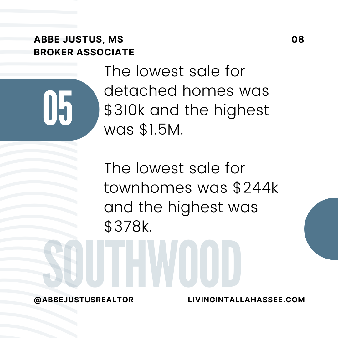 Lastly, the Median Sold Price is $495,000, this is a healthy median price point for Tallahassee neighborhoods. This could be attributed to the high demand for homes in the market, leading to higher prices. Southwood is a popular neighborhood and has been since construction began, making it a solid investment.